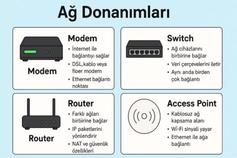 Ağ donanımları, bir bilgisayar ağının fiziksel yapı taşlarıdır. Bu donanımlar sayesinde veri iletimi, yönlendirme, kablolu/kablosuz bağlantı gibi işlemler gerçekleştirilir. Bu bölümde temel ağ donanımları ve işlevleri detaylı olarak incelenecektir. 2.1.